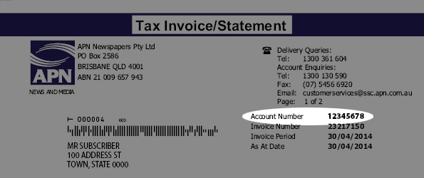 A) Every APN newspaper subscriber is allocated an Account Number. Your number is listed on all subscription-related letters including your ARM invoice / statement. If you don’t know your Account Number, please call our Subscriber Service Team on 1300 361 604 during normal business hours.
